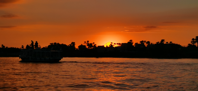 没有了一年一度的泛滥,两岸连保护的堤岸都不需要了。尼罗河就像一条被驯服的巨蛇平静地瘫在东撒哈拉的平原上。它不宽,但时至今日仍然哺育着整个埃及。说是整个埃及,因为几乎所有的一亿人口都住在尼罗河沿岸五十公里的狭长地带内,外加红海之滨和西奈半岛的几个点缀。火车沿河前行,铁路的线性性质几乎就能覆盖埃及的全部。当天傍晚在风帆船上,我们又一次见证尼罗河上的日落。