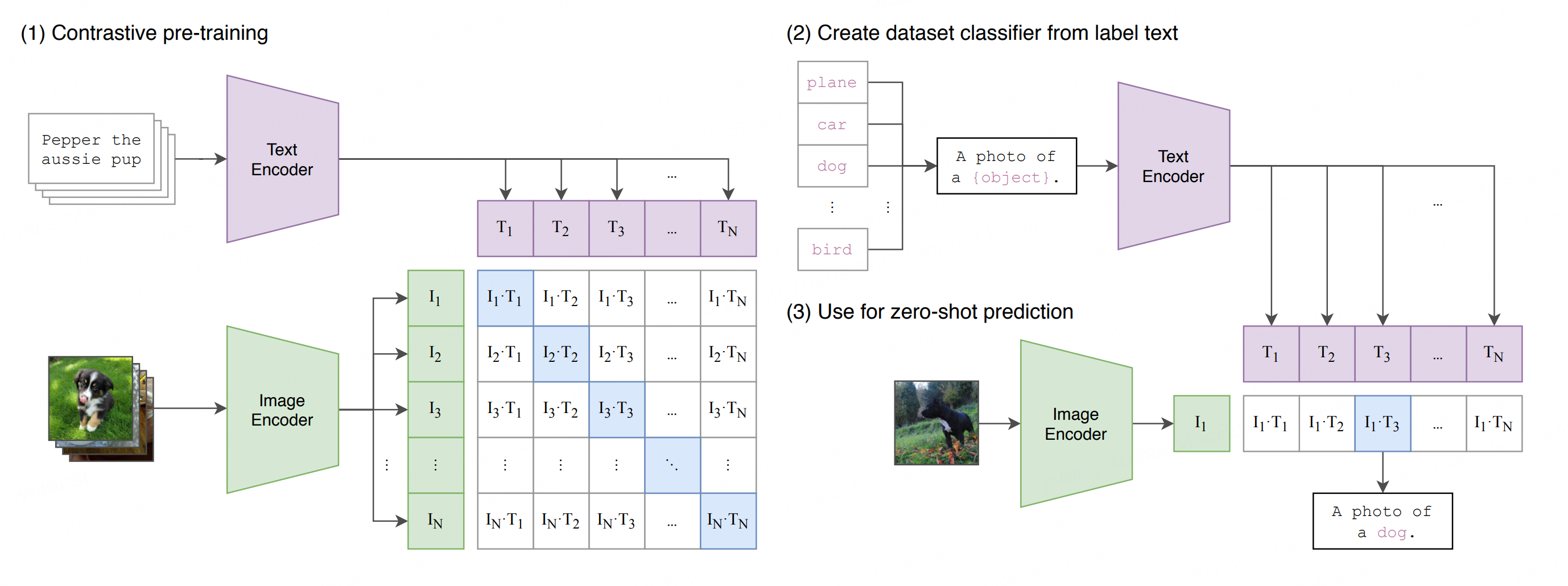 This is contrastive because there is no explicit labels; the loss is generated by comparing relatively the match/similarity between embeddings. At inference time the inputs go through pre-trained encoders and embeddings are compared in the same fashion, where the highest probability text is selected. In implementation the given set of texts are encoded once and cached, so the computation would be unreasonable.
